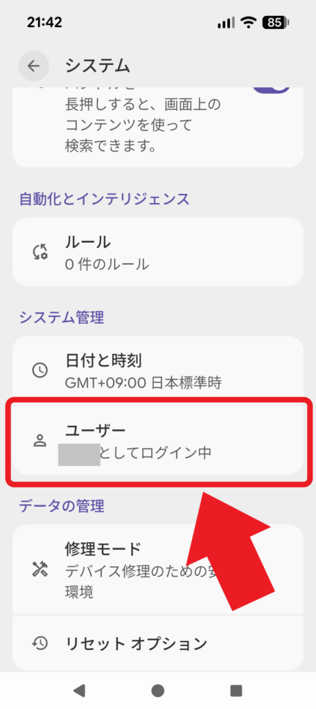 | 【設定のやり方】 [ 設定 ] アプリ → [ システム ] の項目 → [ ユーザー ] の項目 から! |