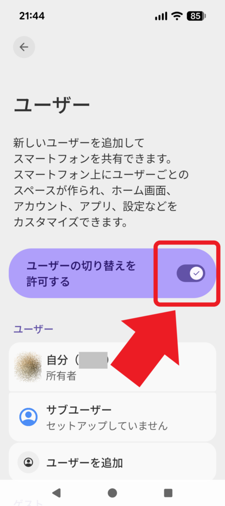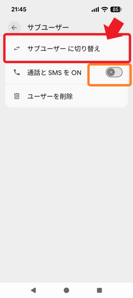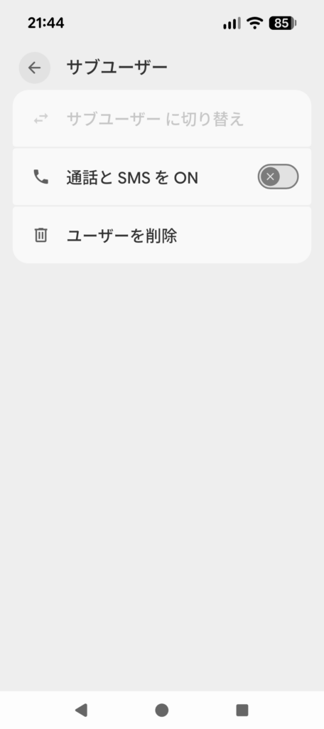 ユーザーを作ったら、実際に切り替えてみましょう。通話やSNSを使える状態にしたいかどうかも、ここで決められます。初期状態ではOFFになっています。