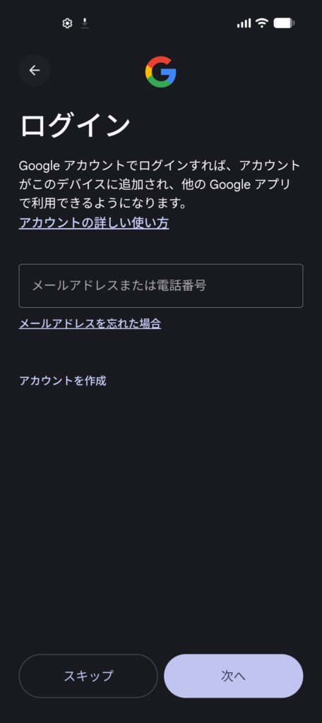 Googleアカウントを使わない場合などは、[ スキップ ] をタップすれば設定せずに次に進めます。後からでも設定できるのでご安心を!
